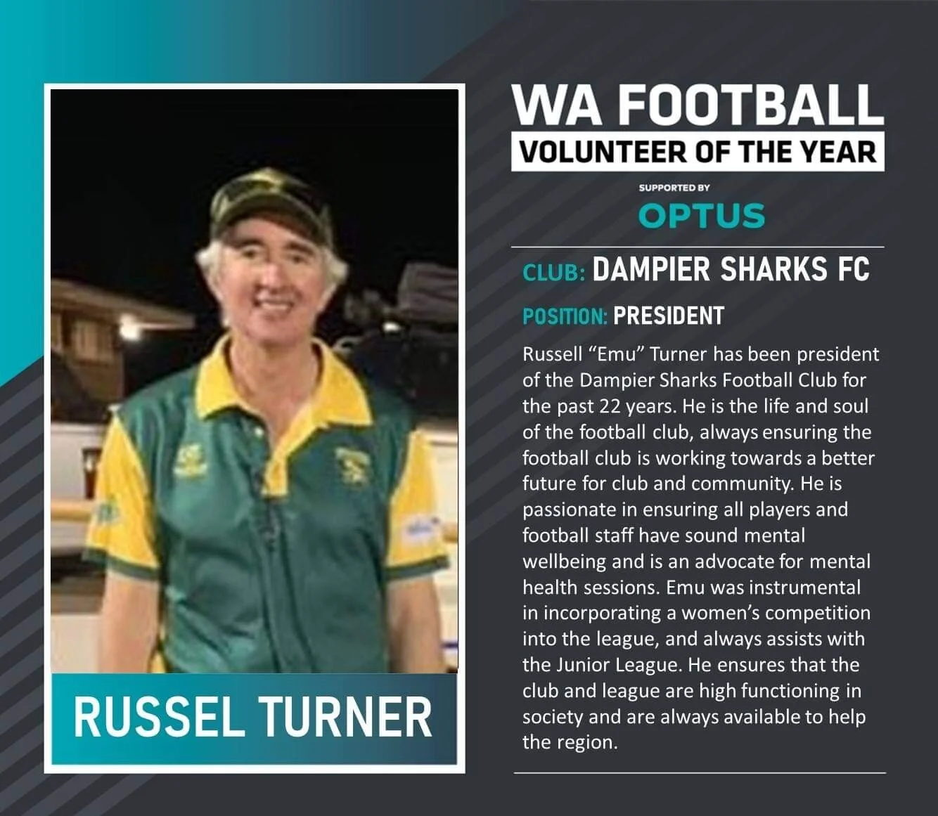 We can’t talk about the Sharks or the sports Club with immediately thinking of Russell ‘ Emu’ Turner, this year has certainly been the year that Emu finally was acknowledged for all his dedicated time and energy to Dampier, thank you Emu you’re a legend. Mentioning sporting legends and again from the Sharkers we’re proud to have names like Dean Cox and Zac Langdon who started there footy career right here in Dampier and not to forget our very own Kristian ‘Dicko’ Dicton leading his path as GM for Football operations for Subi FC. Amazing the talent, energy and drive that comes from our little town. The Sharks, the Jnr Sharks and this year with the Ladies joining the league, a driven, focused and hard working committee the further is bright and in the words of someone famous ‘ GO YOU SHARKERS’.